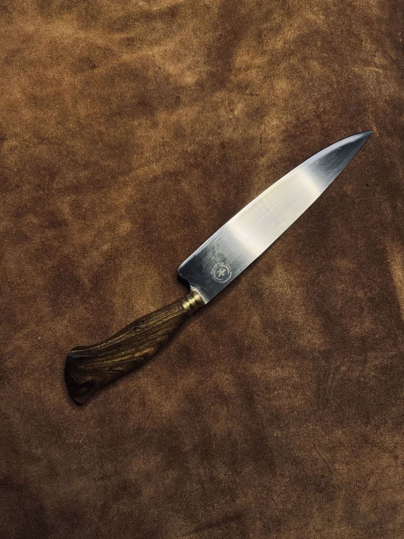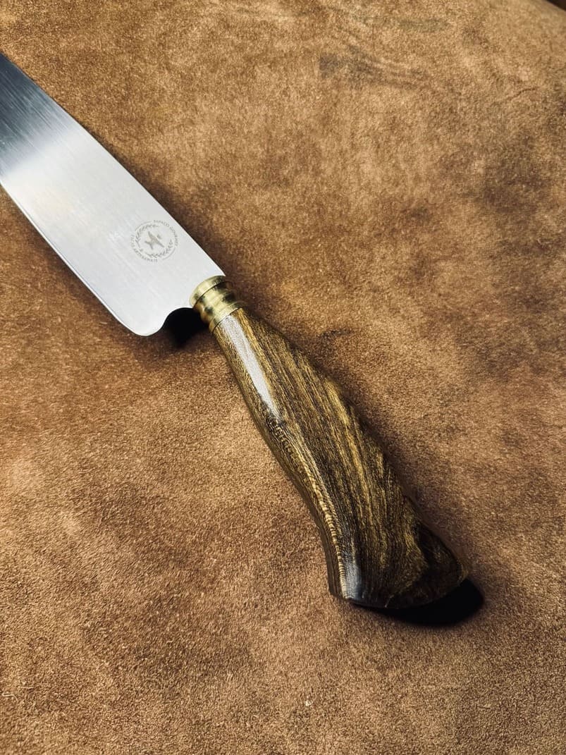 Faca artesanal forjada à mão, lâmina de 22 cm com acabamento acetinado e cabo ergonômico em Louro Preto. Sofisticação, precisão e desempenho no churrasco.
