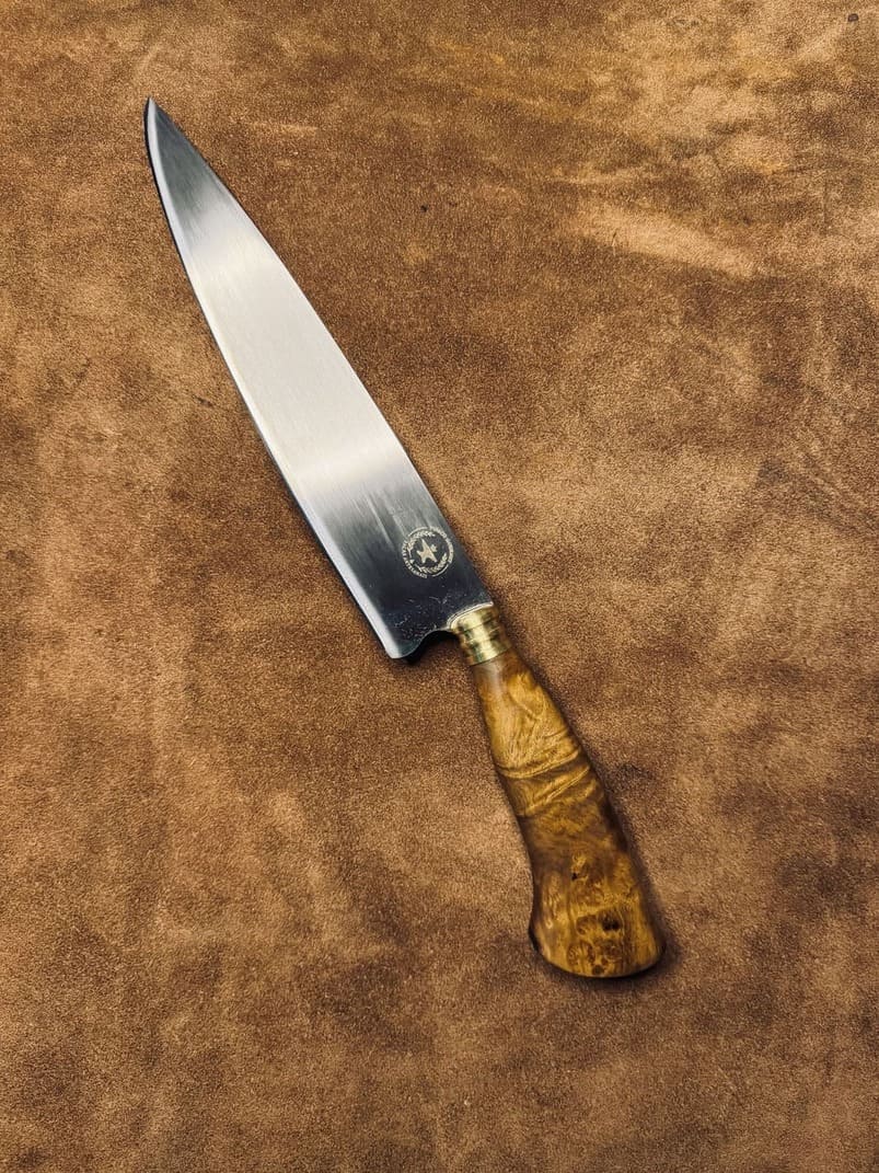 O cabo tipo Pistol Grip, esculpido com precisão em Radica de Imbuia, oferece pegada firme, confortável e elegante, com um visual marcante graças às características naturais da madeira. Já o acabamento acetinado na lâmina destaca o requinte da peça e facilita a higienização.