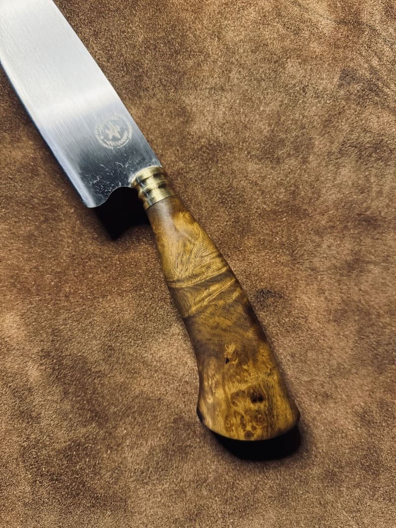 Faca artesanal com lâmina de aço carbono 1070 com acabamento acetinado, cabo ergonômico estilo pistol em madeira Radica de Imbuia. Combinação perfeita entre suavidade e desempenho.